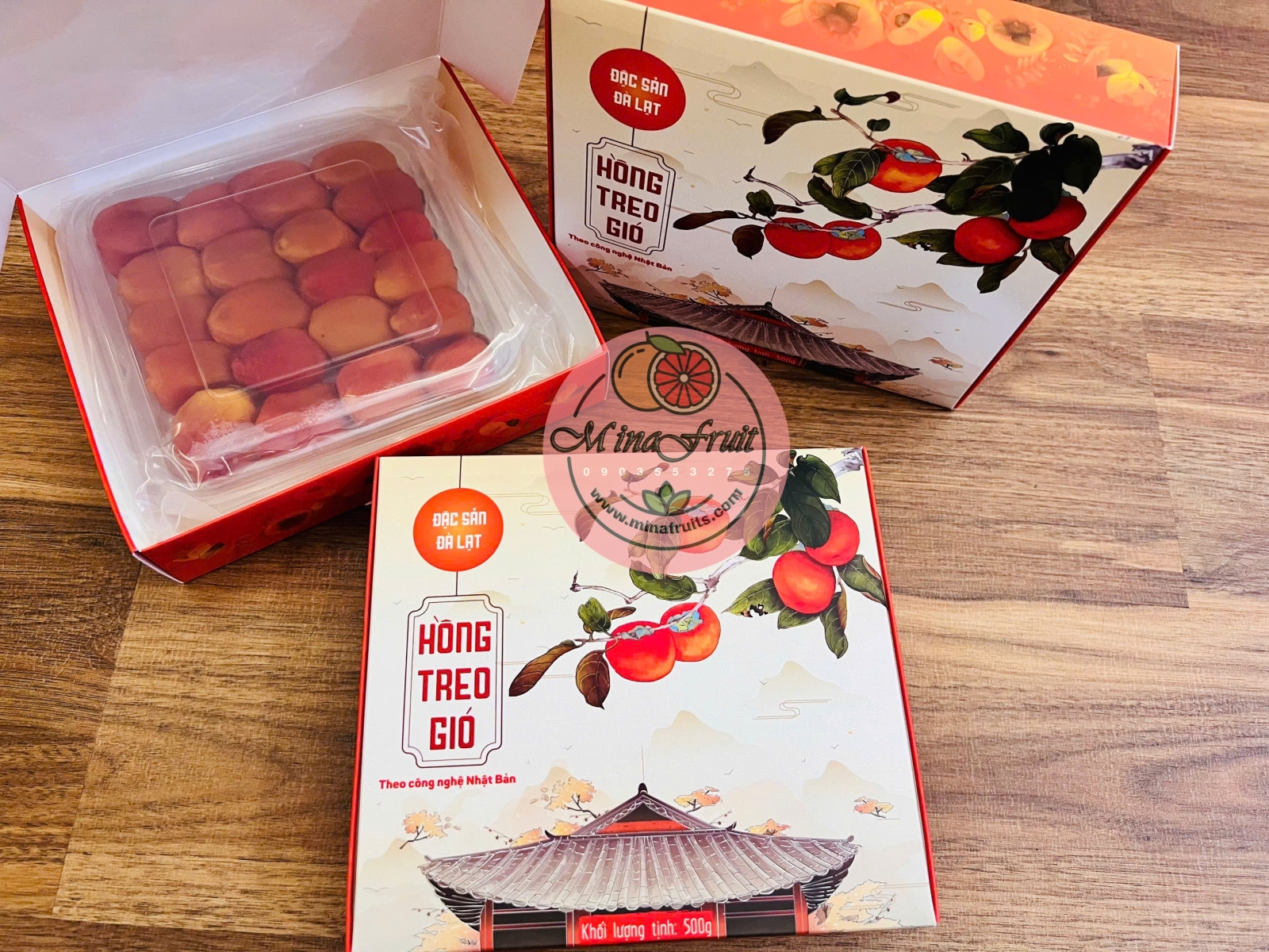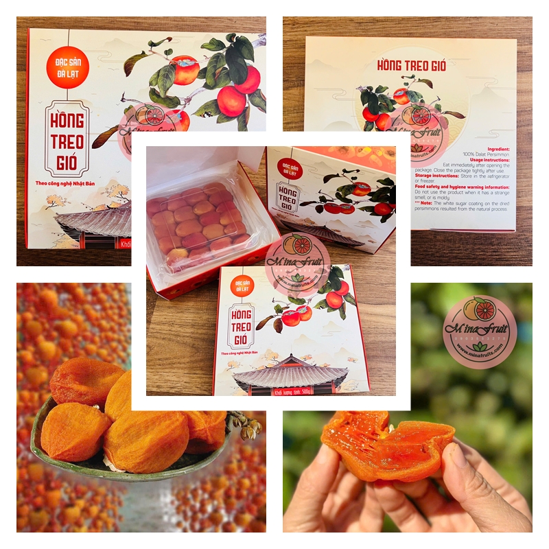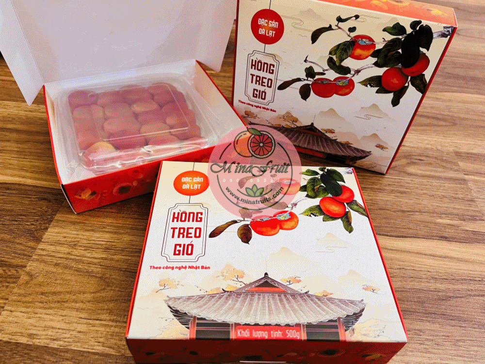 Hồng treo gió (hồng kem) là đặc sản Đà Lạt cao cấp được làm từ những trái hồng chín đỏ, tuyển chọn kỹ lưỡng và sấy theo công nghệ chuẩn Nhật Bản. Thành phẩm cho ra từng miếng hồng dẻo mềm – thơm ngọt – mặt ngoài phủ lớp phấn trắng tự nhiên, được gọi là “kem hồng”. Lớp “kem” này chính là thành phần đường trong quả hồng cô đọng lại, hoàn toàn tự nhiên – không tẩm đường – không chất bảo quản.