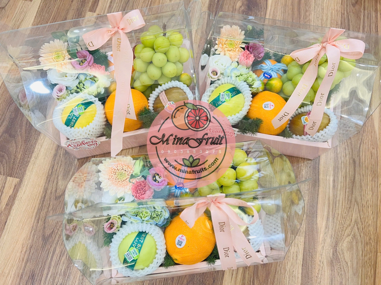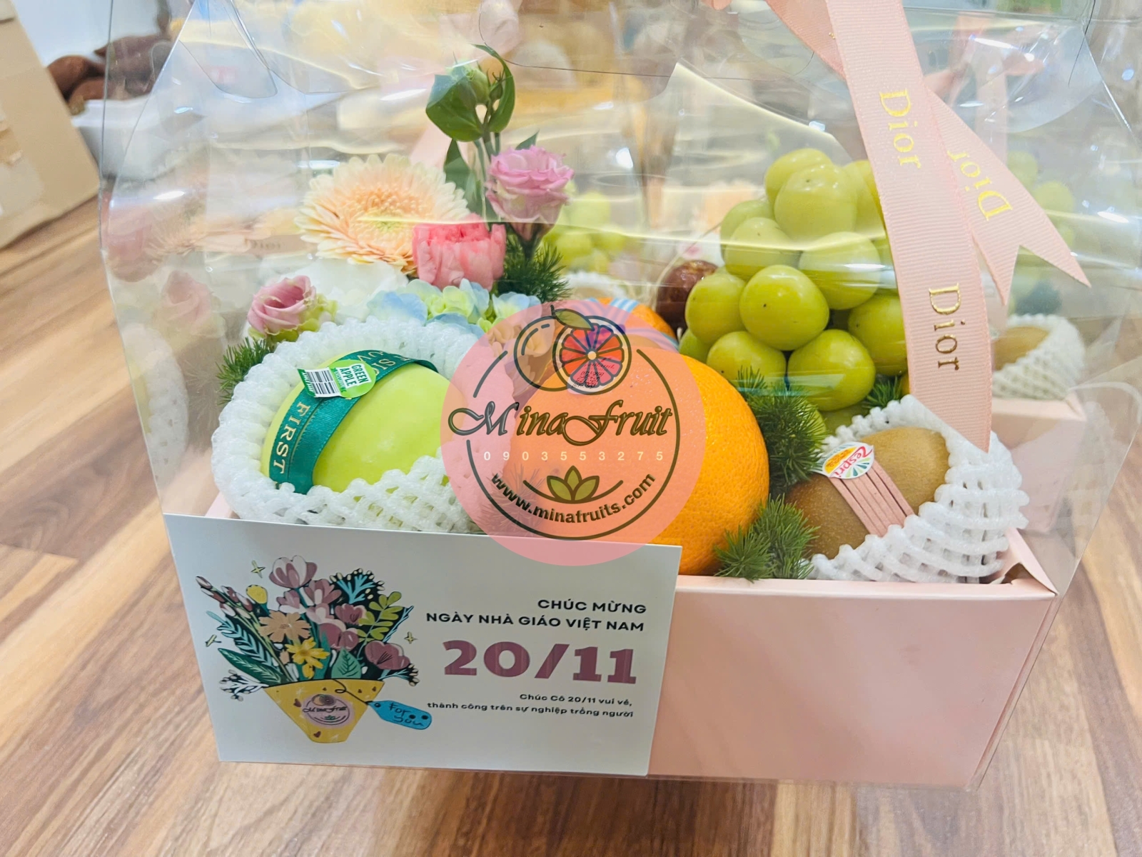 Hộp quà trái cây và hoa MNH021 là lựa chọn quà tặng sang trọng và tinh tế dành cho Ngày Nhà Giáo Việt Nam 20/11. Thiết kế hộp hồng thanh lịch, nơ Dior cao cấp và lớp hộp mica trong giúp tôn lên vẻ đẹp của từng loại quả cao cấp bên trong.