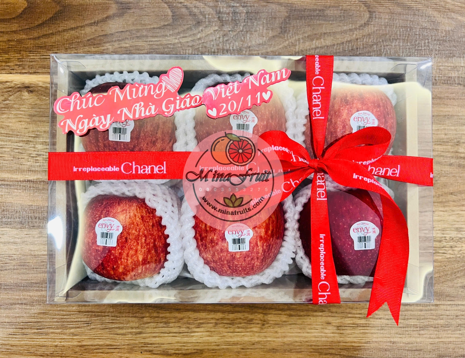Hộp trong suốt giúp tôn lên vẻ đẹp tự nhiên của trái cây, kết hợp cùng nơ ruy băng đỏ in chữ Chanel tạo cảm giác sang trọng, hiện đại. Thiết kế phù hợp để tặng trong các dịp như: